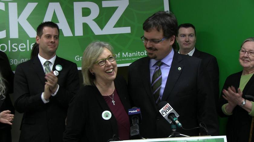 Winnipeg, April 15, 2016: Green Party of Canada Leader Elizabeth May joined with James Beddome and David Nickarz of the Green Party of Manitoba for a news conference on the positive impact a Green MLA could have on the Manitoba Legislature.