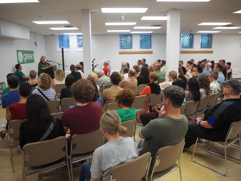 Green Party of Canada Leader Elizabeth May was our featured guest at the WestEnd Commons last night. Elizabeth spoke about the urgency of the climate crisis that threatens human civilization unless green house gas emissions are reduced drastically. Without sugar-coating the seriousness of the situation, she inspired a sense of hope and confidence that humanity can overcome this challenge to our survival. Joining her at the podium, was Green Party of Manitoba candidate David Nickarz, who is working very hard to become the MLA for Wolseley constituency.